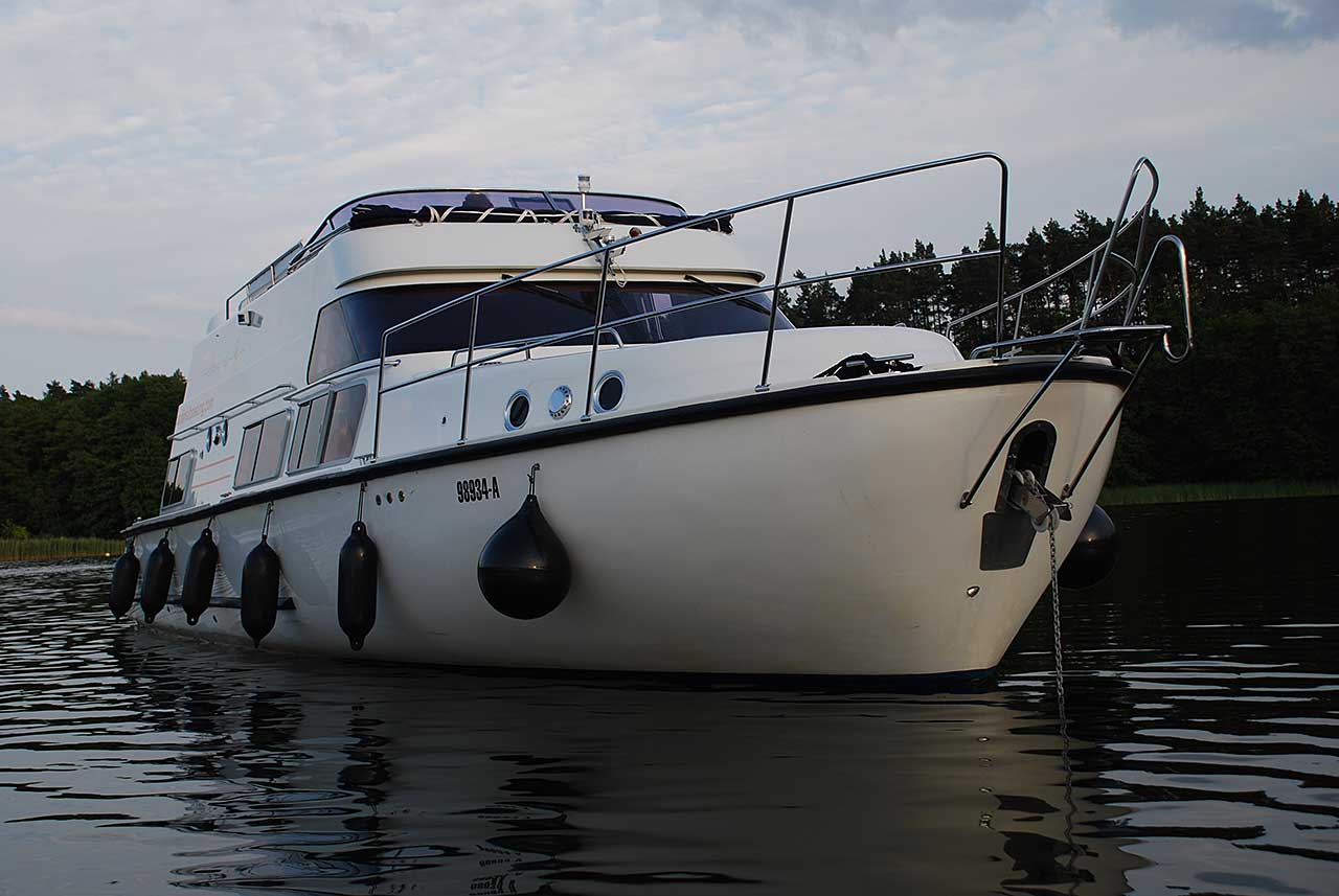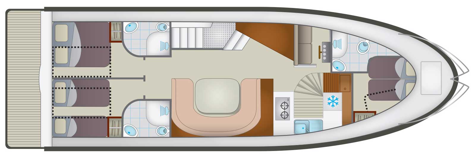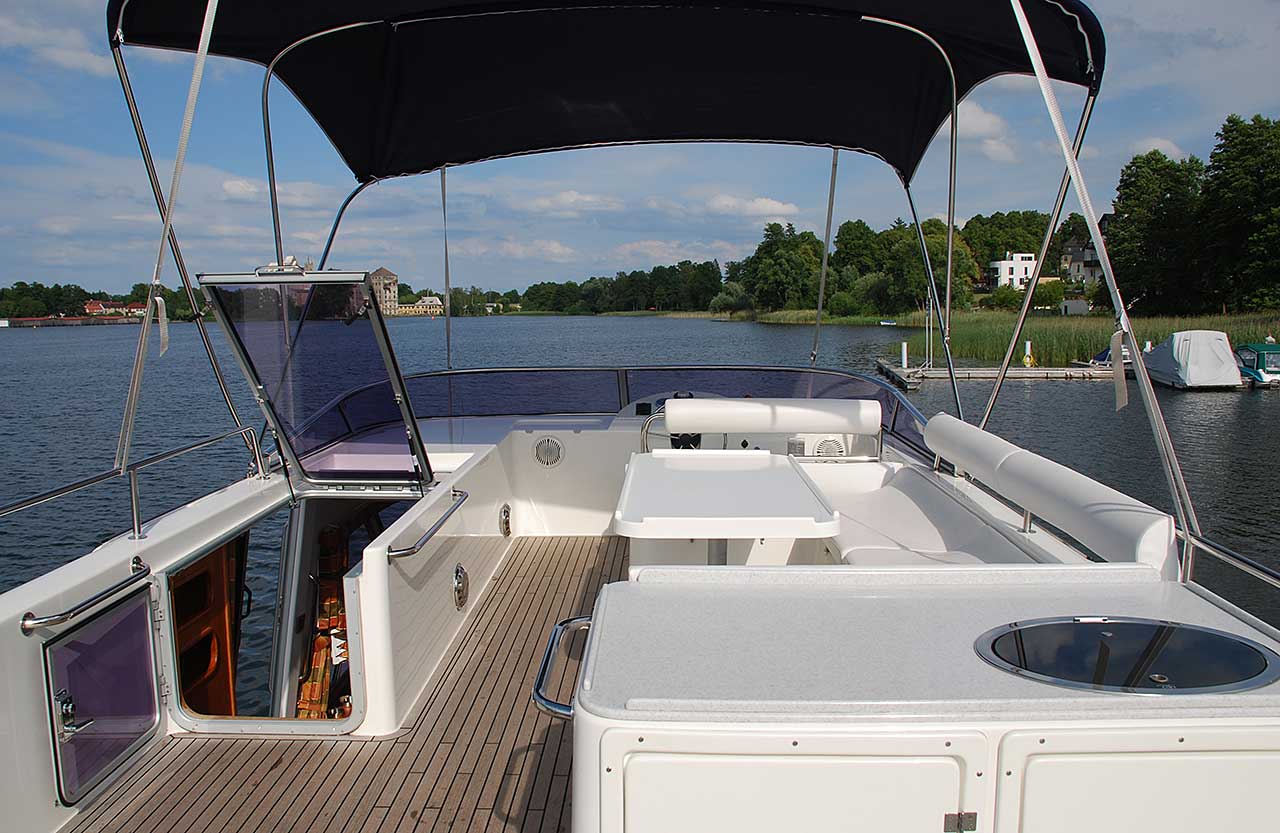 Ta niezwykle wygodna łódź oferuje 3 kabiny z łazienkami, ale także duży pokład górny wyposażony m.in. w umywalkę i lodówkę oraz zewnętrzne stanowisko sterowe.
